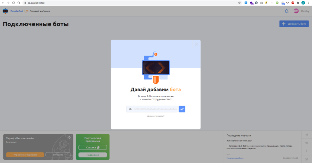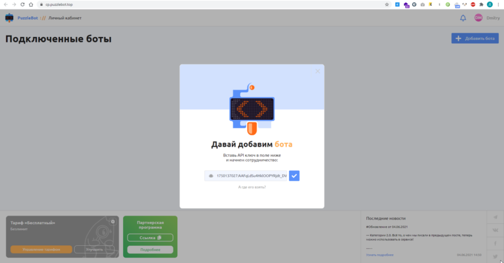 Сохраните данный токен (API Token), вы будете его использовать для связки вашего бота с сервисом PuzzleBot.