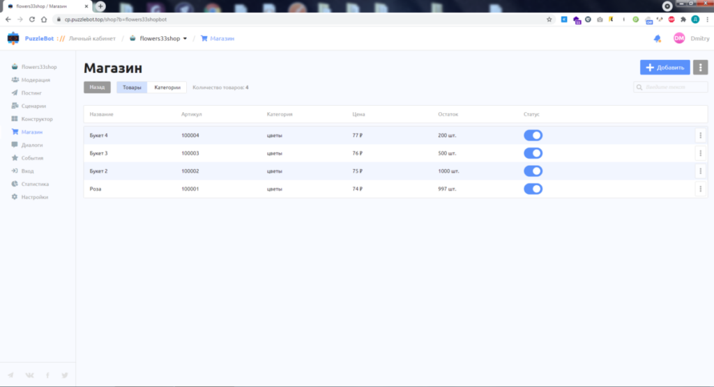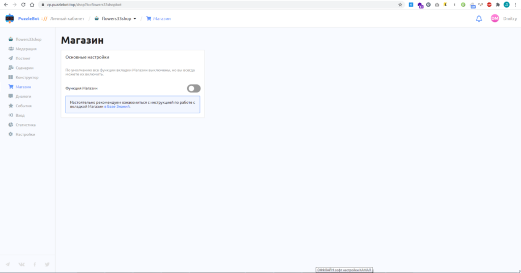 5. После этого ваш бот будет привязан в сервисе PuzzleBot и вы сможете активировать функционал магазина.