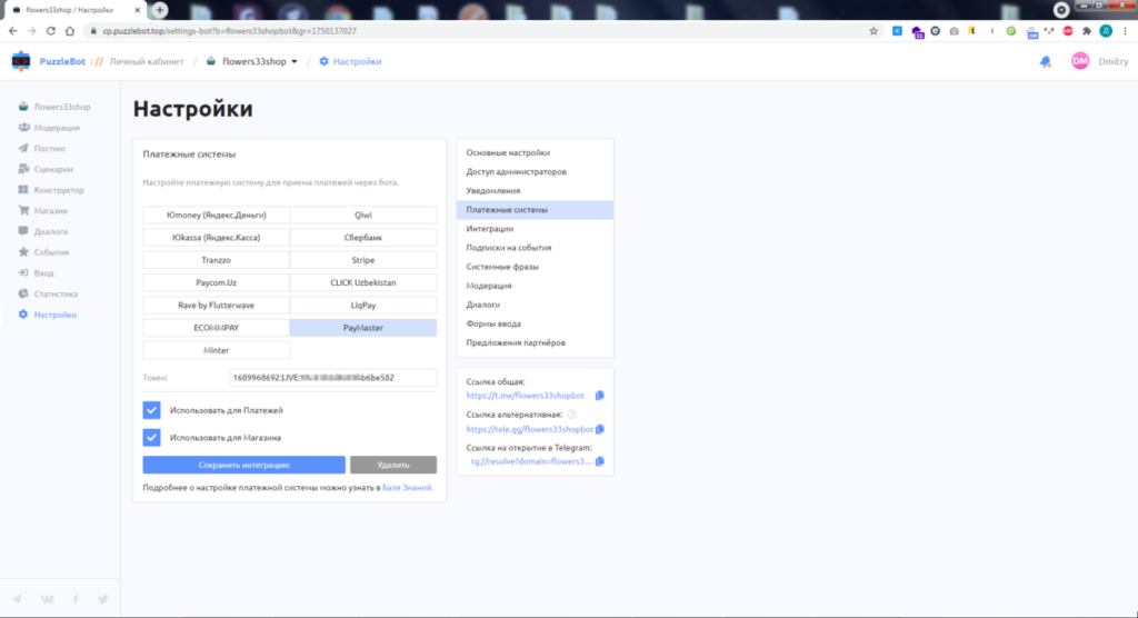 Далее в разделе Настройки Платежные системы выберите PayMaster и укажете данные ранее сохраненного тесового PayMaster TEST или боевого PayMaster LIVE платежного токена. После этого тестовая или боевая оплата в боте PuzzleBot будет настроена и доступна. Если вы настраиваете тестовую оплату в дальнейшем вы сможете изменить тестовый токен на боевой.