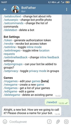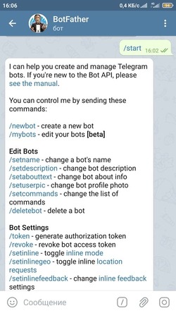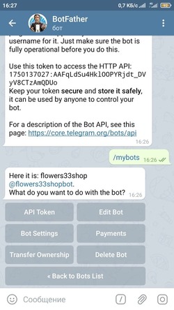 3. Теперь у нас есть бот, которым мы можем управлять. Но пока наш бот без какой либо начинки – функционала и его необходимо дальше настроить.