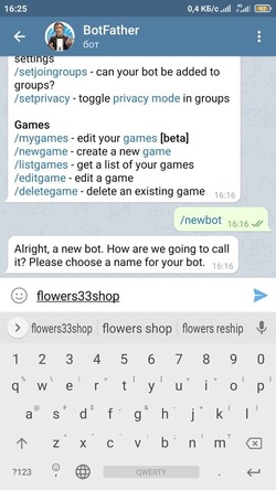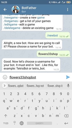 Далее, необходимо будет вести имя пользователя (адрес по которому вашего бота можно будет найти через поиск telegram). Юзернейм должен быть уникальным и обязательно заканчиваться на bot.