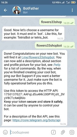 В ответ BotFather пришлет в ответ сообщение с токеном — «ключом» для доступа к созданному боту.