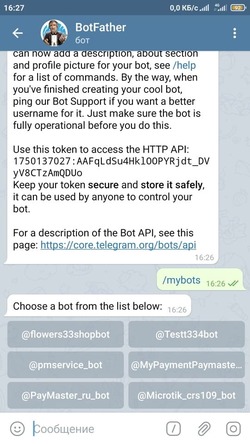 3. Далее в @BotFather оправьте команду /mybots. Нажмите на имя своего бота.