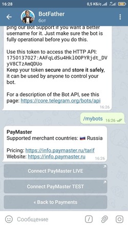 Для подключения реальной оплаты, отправьте боту PayMaster LIVE команду /start
