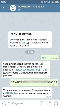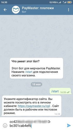 Далее отправьте боту идентификатор сайта из вашего ЛК PayMaster.