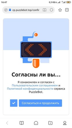 После этого, ваш аккаунт в сервисе PuzzleBot будет успешно создан и вы можете приступать к настройке магазина. Для этого перейдите в личный кабинет PuzzleBot и подтвердите согласие с пользовательским соглашением.