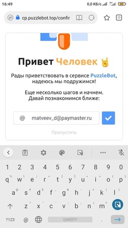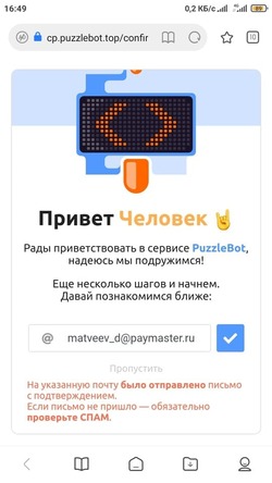 Подтвердите введенный почтой адрес, пройдя по ссылке из письма автоматически отправленного сервисом PuzzleBot.