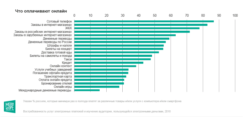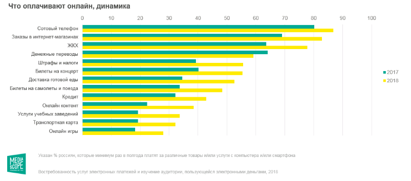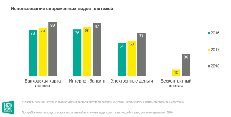 Согласно статистике исследовательской компании Mediascope, наиболее популярными в онлайн-среде остаются банковские карты. Оборот российского рынка интернет-эквайринга составляет 6 000 000 000 рублей (по данным spark.ru).