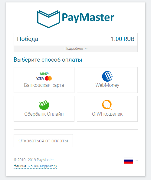1. Классический метод, при котором для совершения покупки покупатель переходит на платежную страницу PayMaster.
