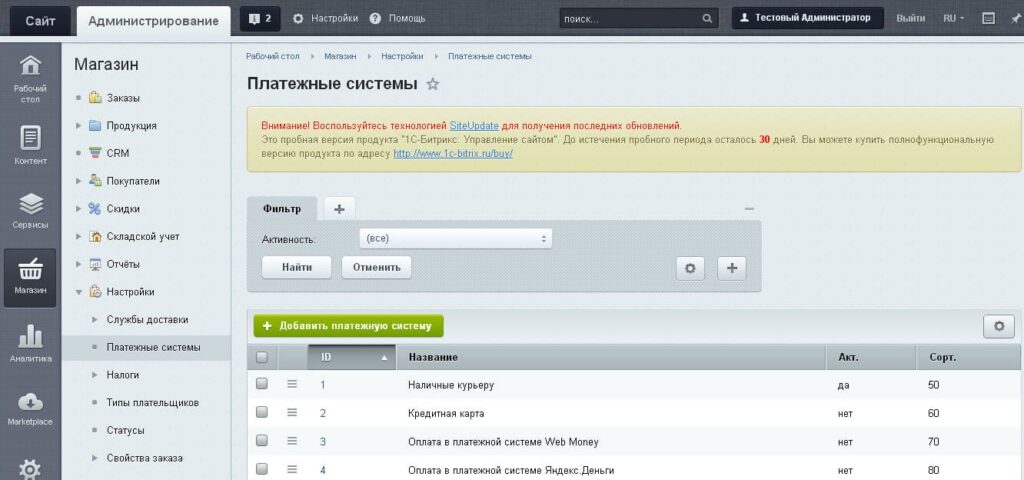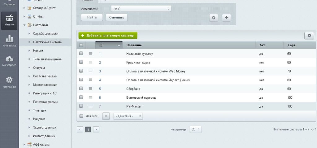 2. В вертикальном меню выбрать «Магазин» -> «Настройки» -> «Платежные системы»