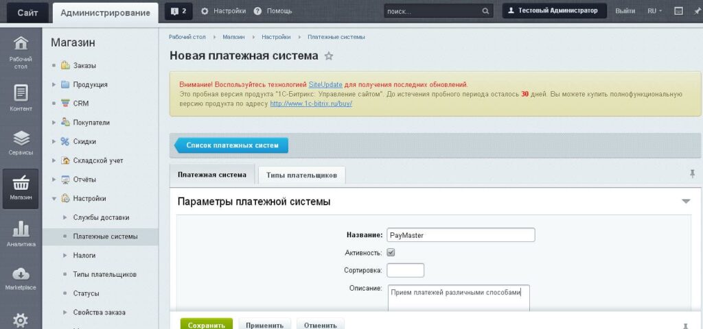 4. Введите название платежной системы «PayMaster» и краткое описание (необязательно). Нажмите «Сохранить»