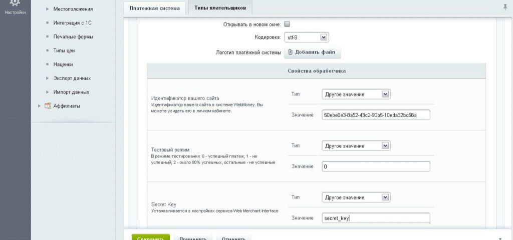10. Укажите режим тестового режима и секретный ключ. Секретный ключ задается в настройках сайта в Личном Кабинете.