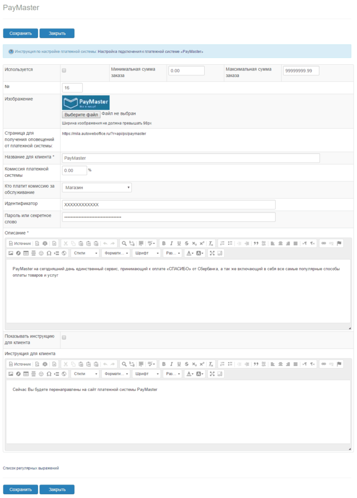 - Используется — поставьте галочку (тем самым Вы позволите Вашим клиентам выбирать «PayMaster» в качестве способа оплаты Ваших товаров и услуг);