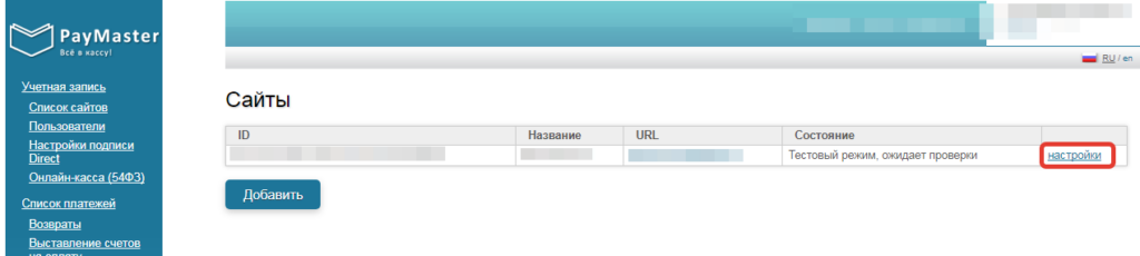 - Вы попадете в раздел «Сайты», в котором будут показаны все ранее зарегистрированные Вами сайты в платежной системе «PayMaster». Выберите интересующий Вас сайт и нажмите на кнопку «Настройки» в правой части списка сайтов: