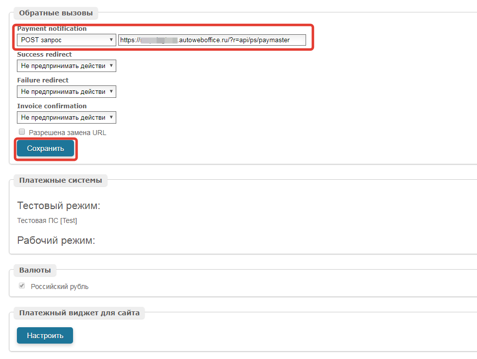 - Повторно отправлять Payment Notification при сбоях — поставьте галочку и оповещение о платеже от платежной системы «PayMaster» в АвтоВебОфис будет автоматически переотправлено, если первая попытка была неудачной;