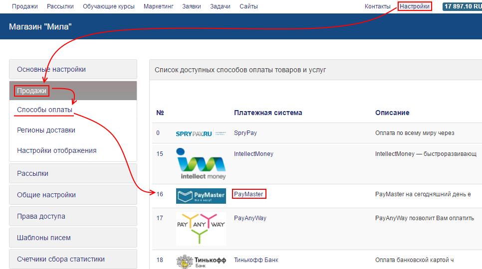 - На открывшейся странице выберите пункт «Способы оплаты» в разделе «Продажи». В списке доступных для подключения способов оплаты найдите платежную систему «PayMaster» и перейдите на страницу изменения настроек подключения платежной системы «PayMaster»;