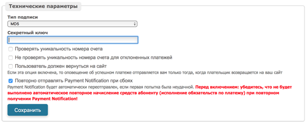 - Hash method for SIGN request option: Тип подписи запроса. По умолчанию рекомендуем использовать md5.