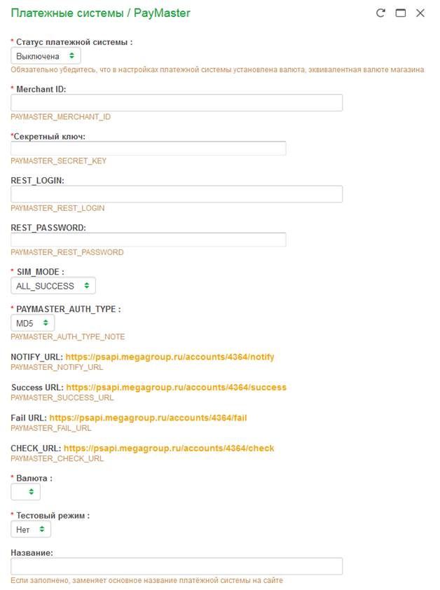 2. После подключения PayMaster со стороны MegaGroup Вам нужно в списке «Платежные системы» выбрать PayMaster и заполнить следующие обязательные поля, отмеченные звездочкой: